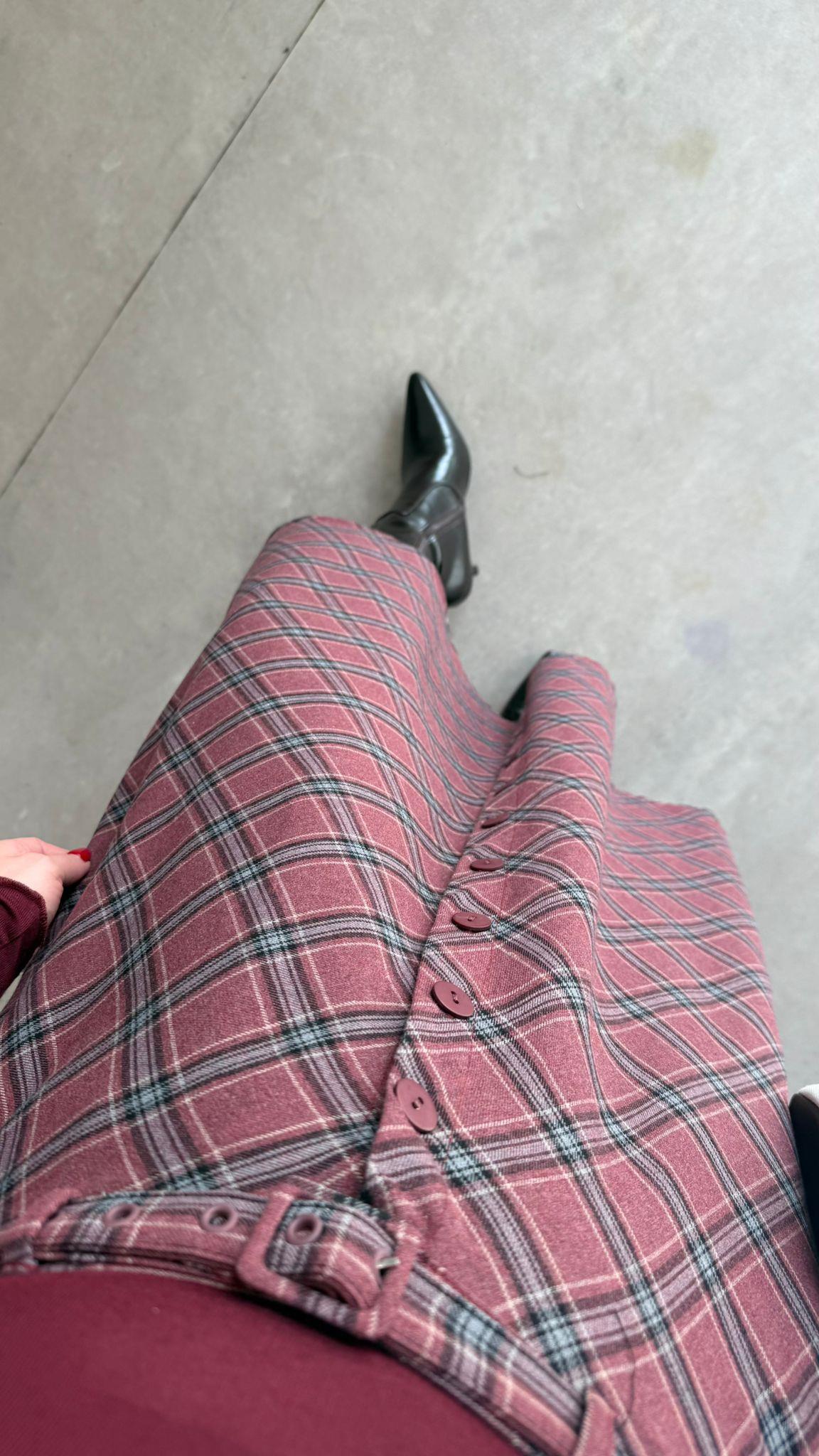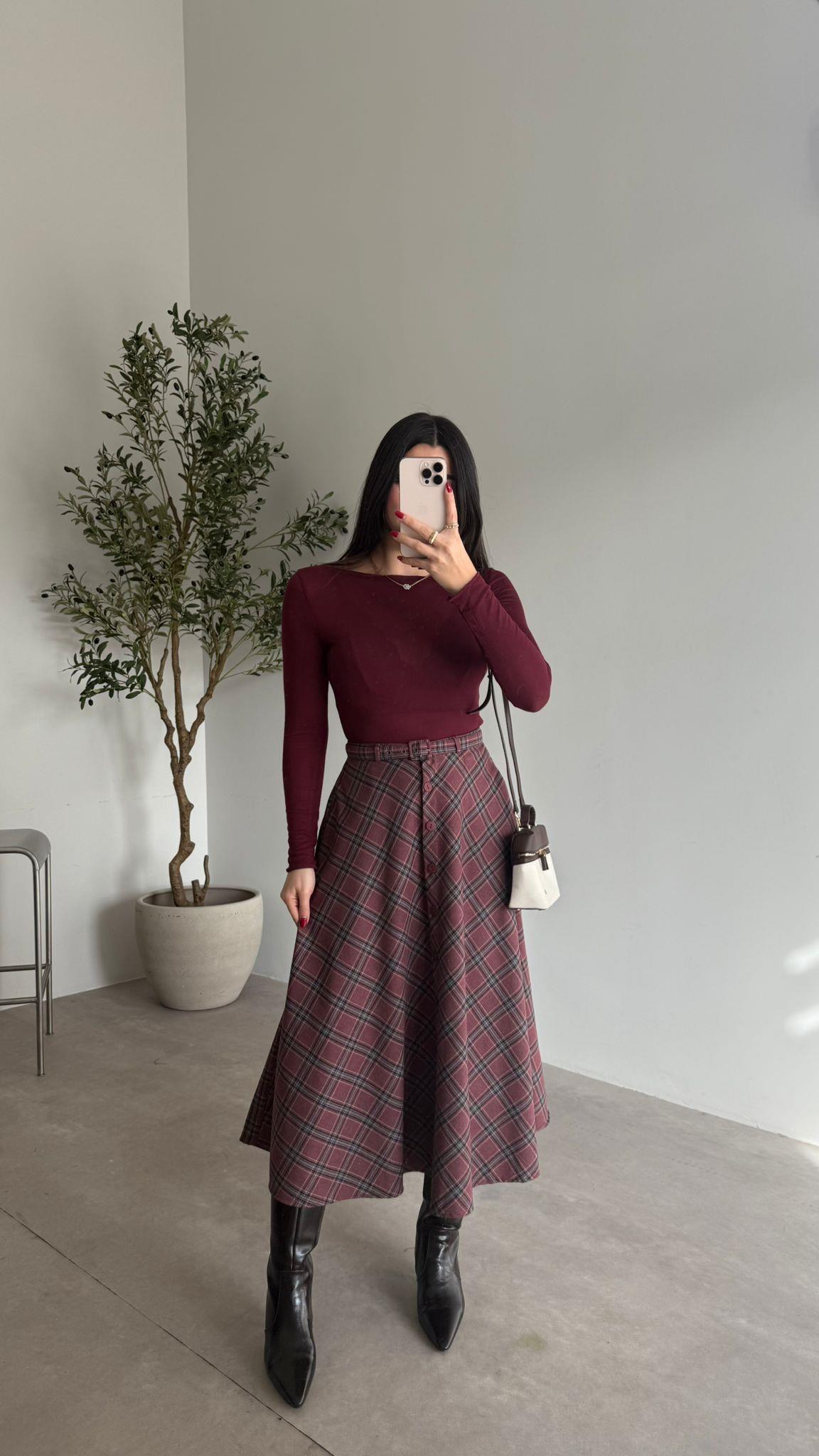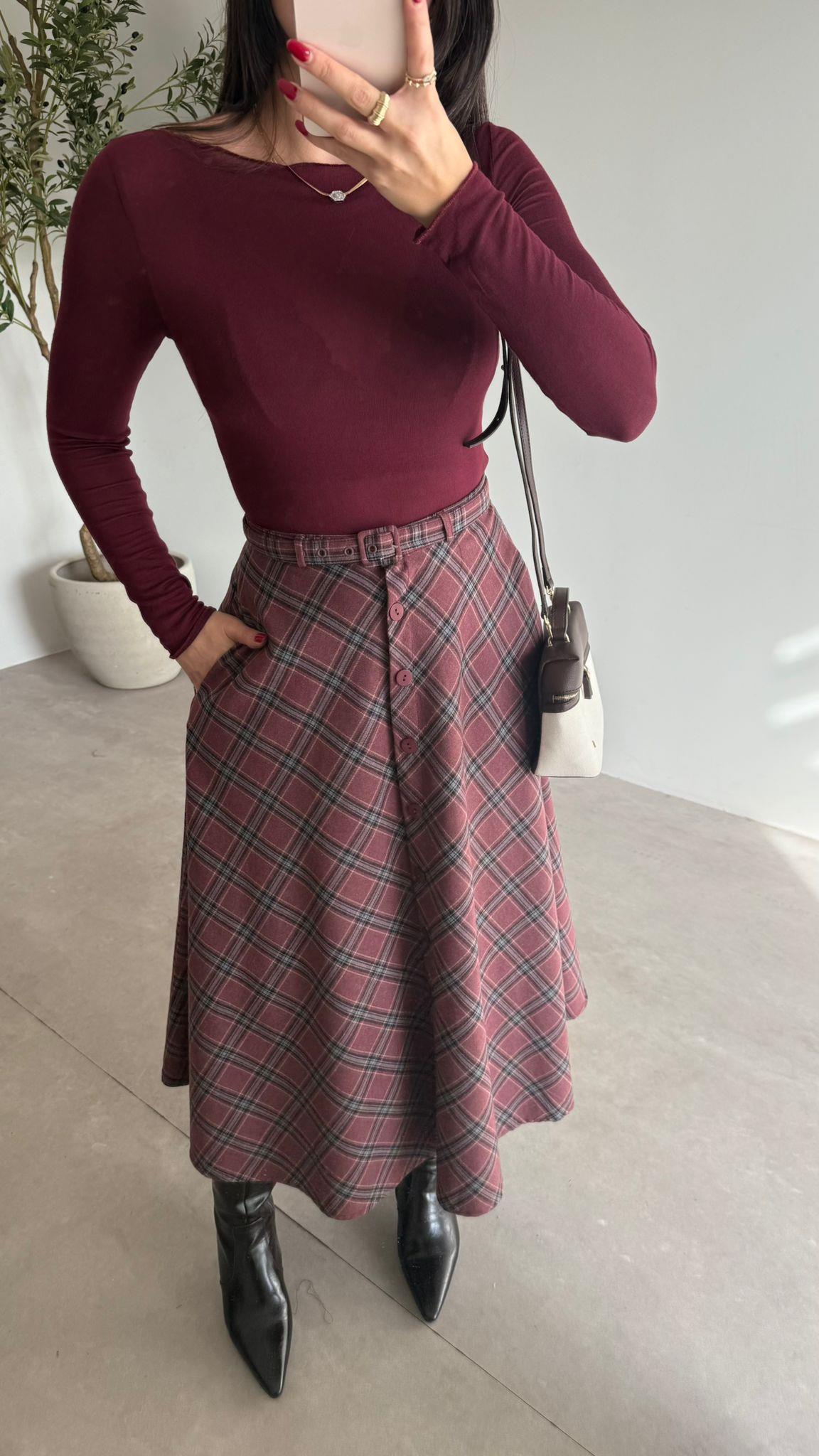 Bordo Düğmeli Ekose Etek (14957)