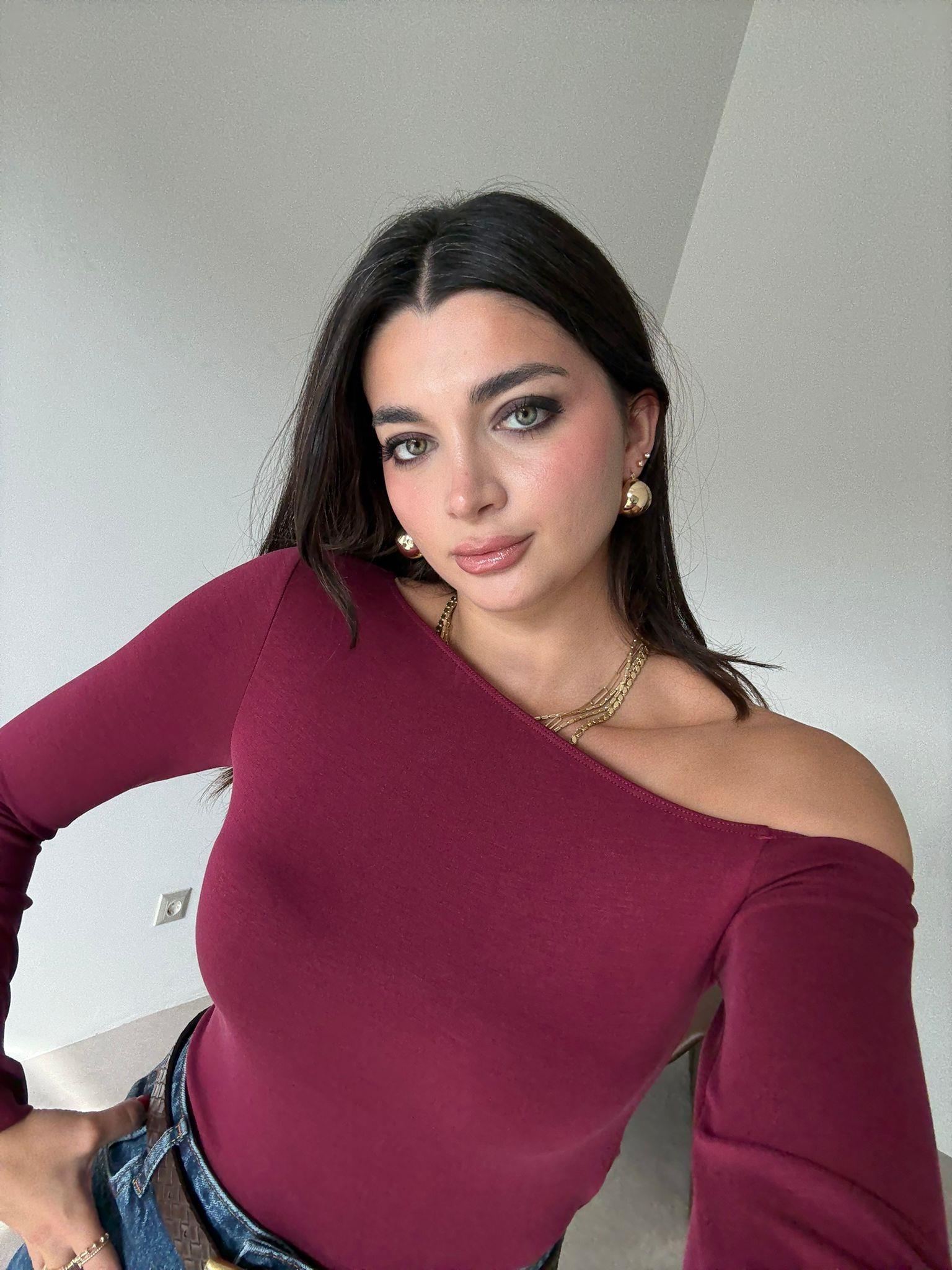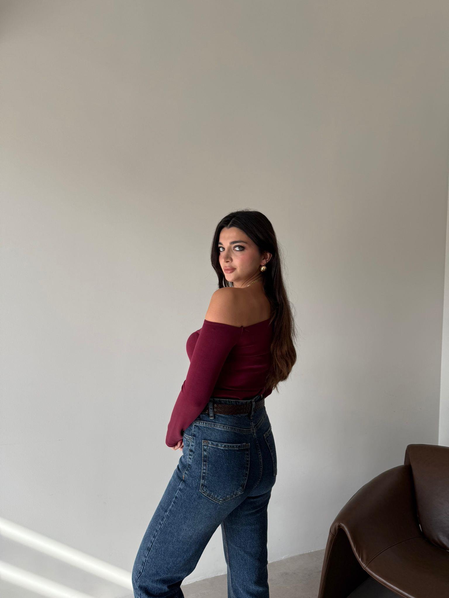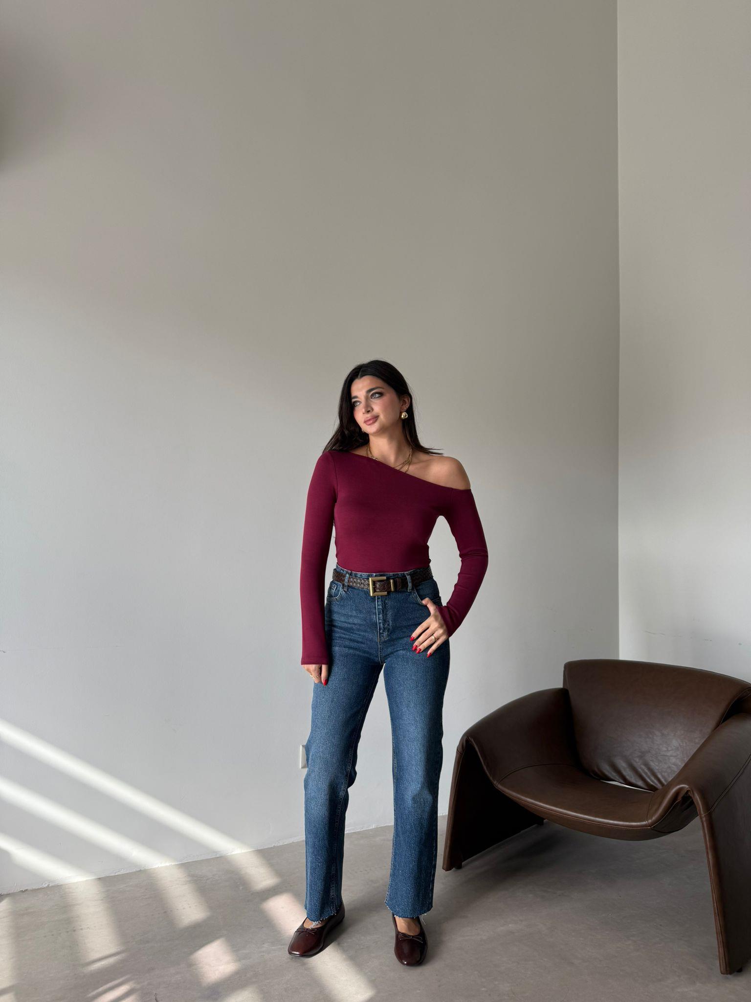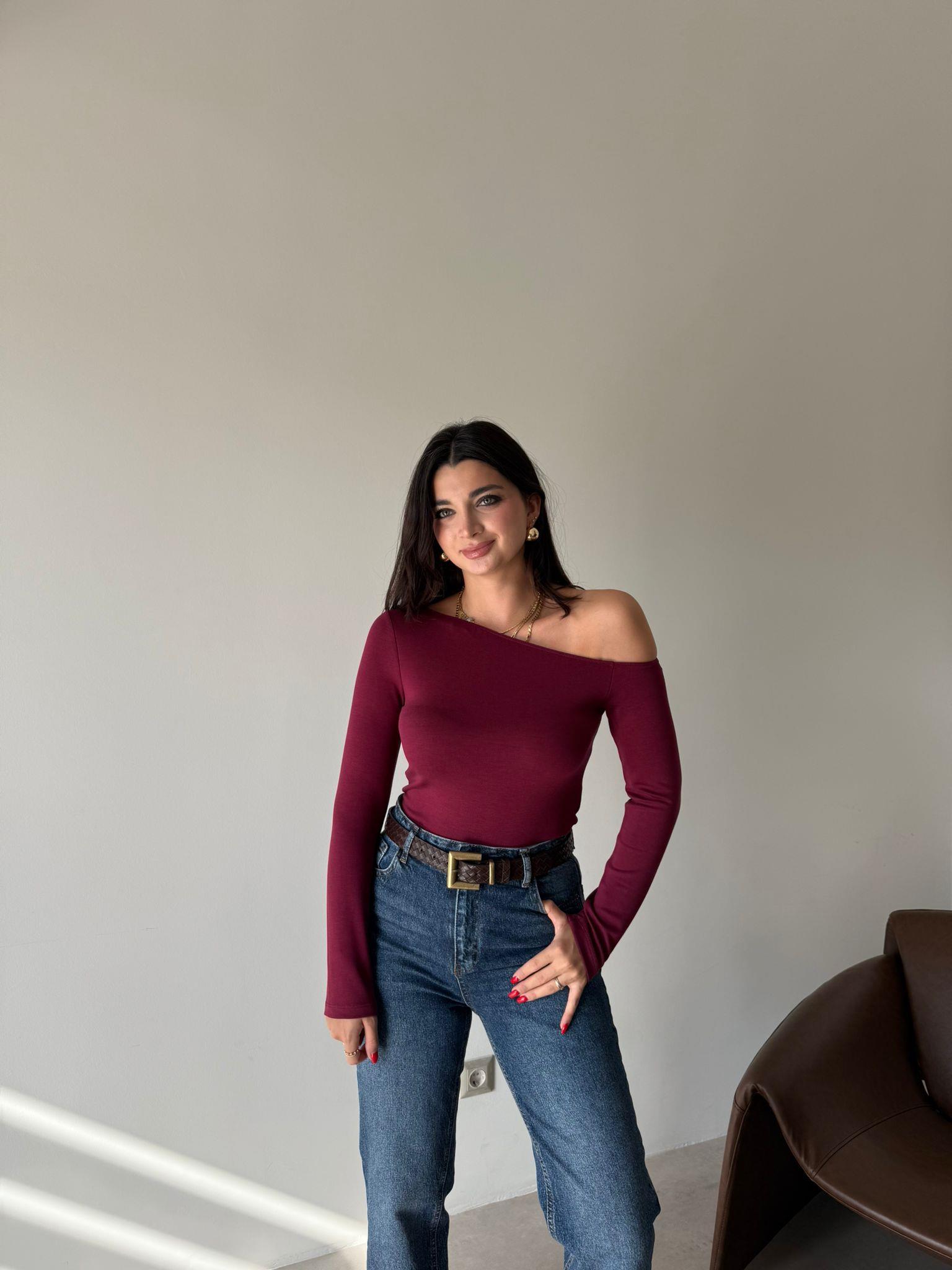 Bordo Özel Dokulu Asimetrik Bluz (14160)
