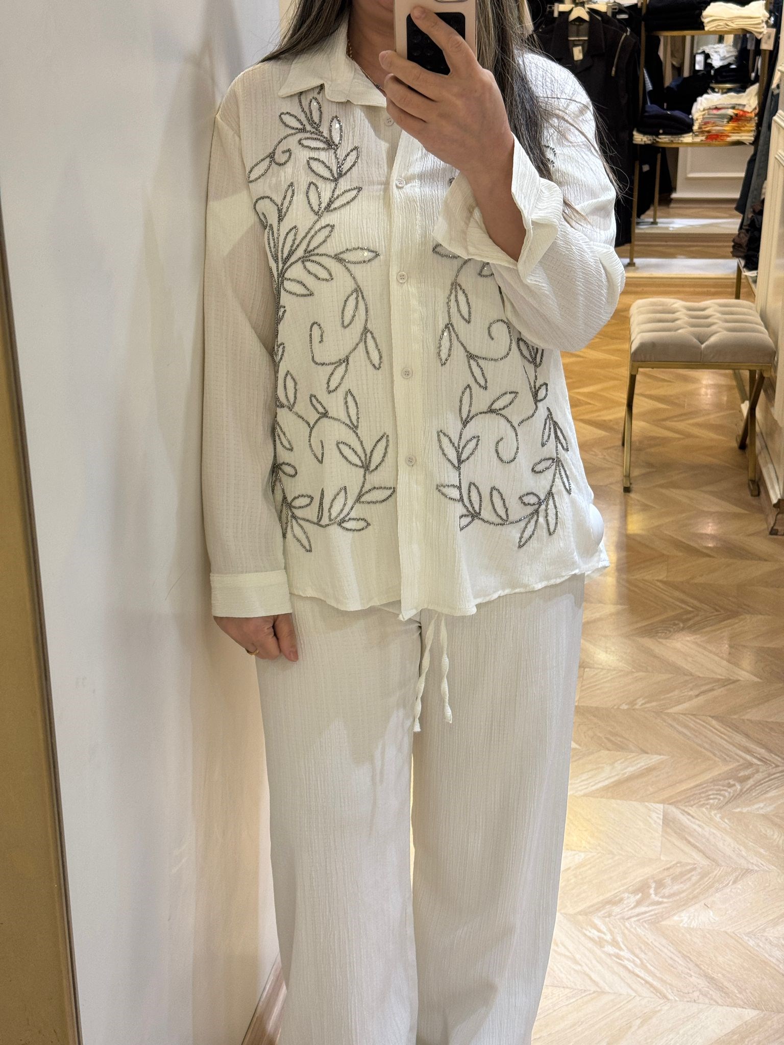 Ekru Boncuk İşlemeli Oversize Takım (15252)