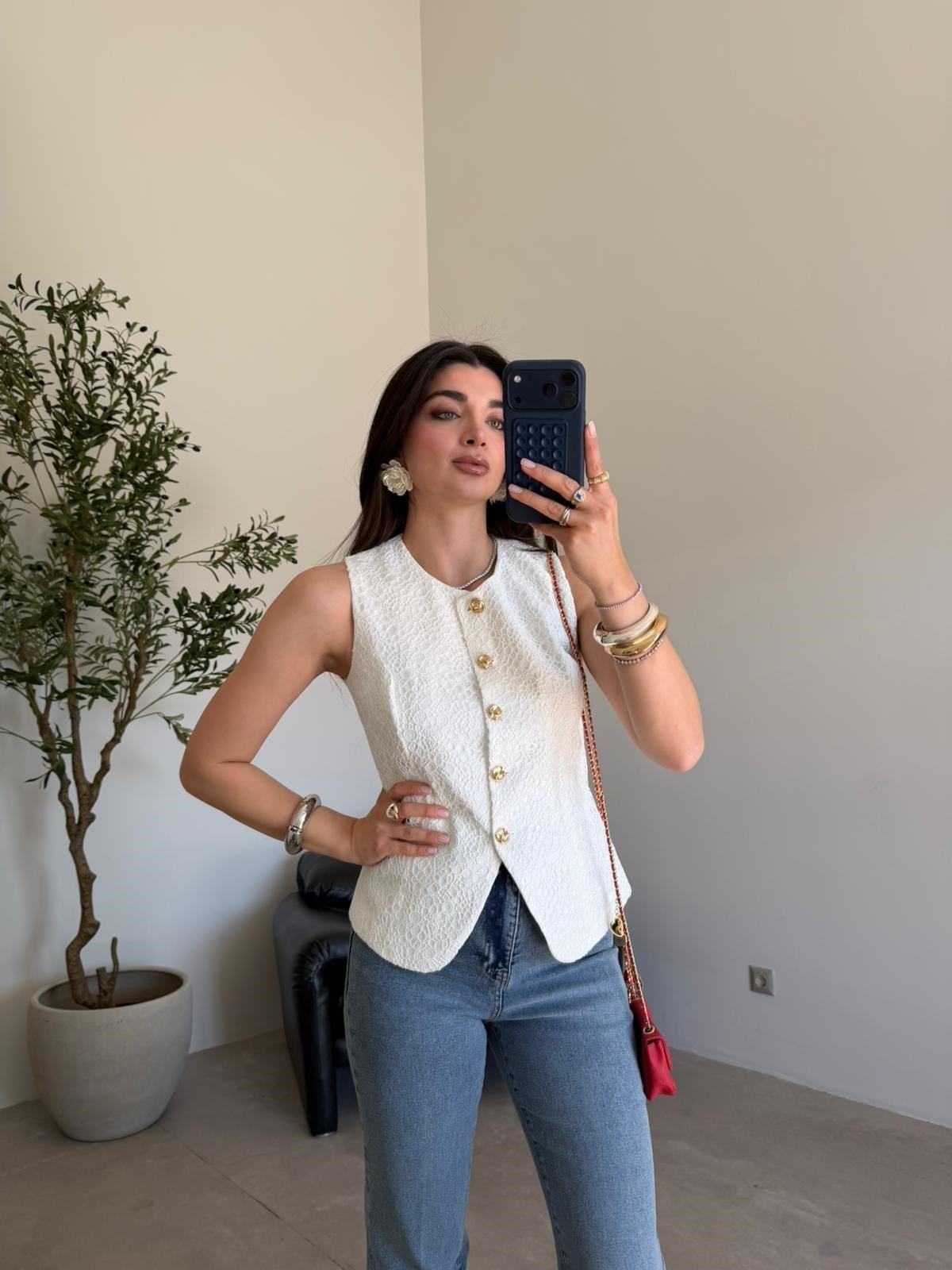 Ekru Gold Düğmeli Dantel Yelek (15560)