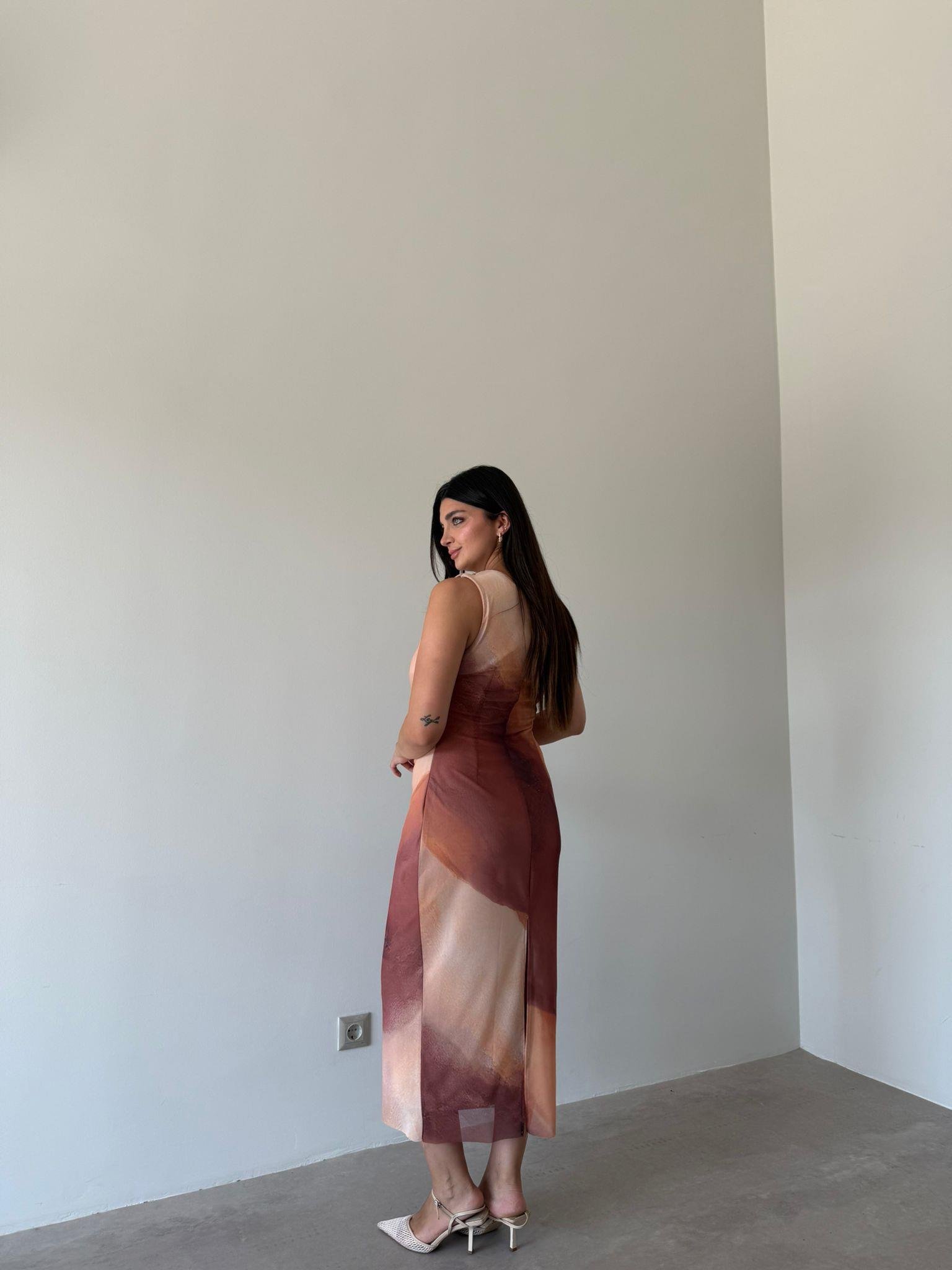 Kahve Drapeli Toka Detaylı Tül Elbise (13921)