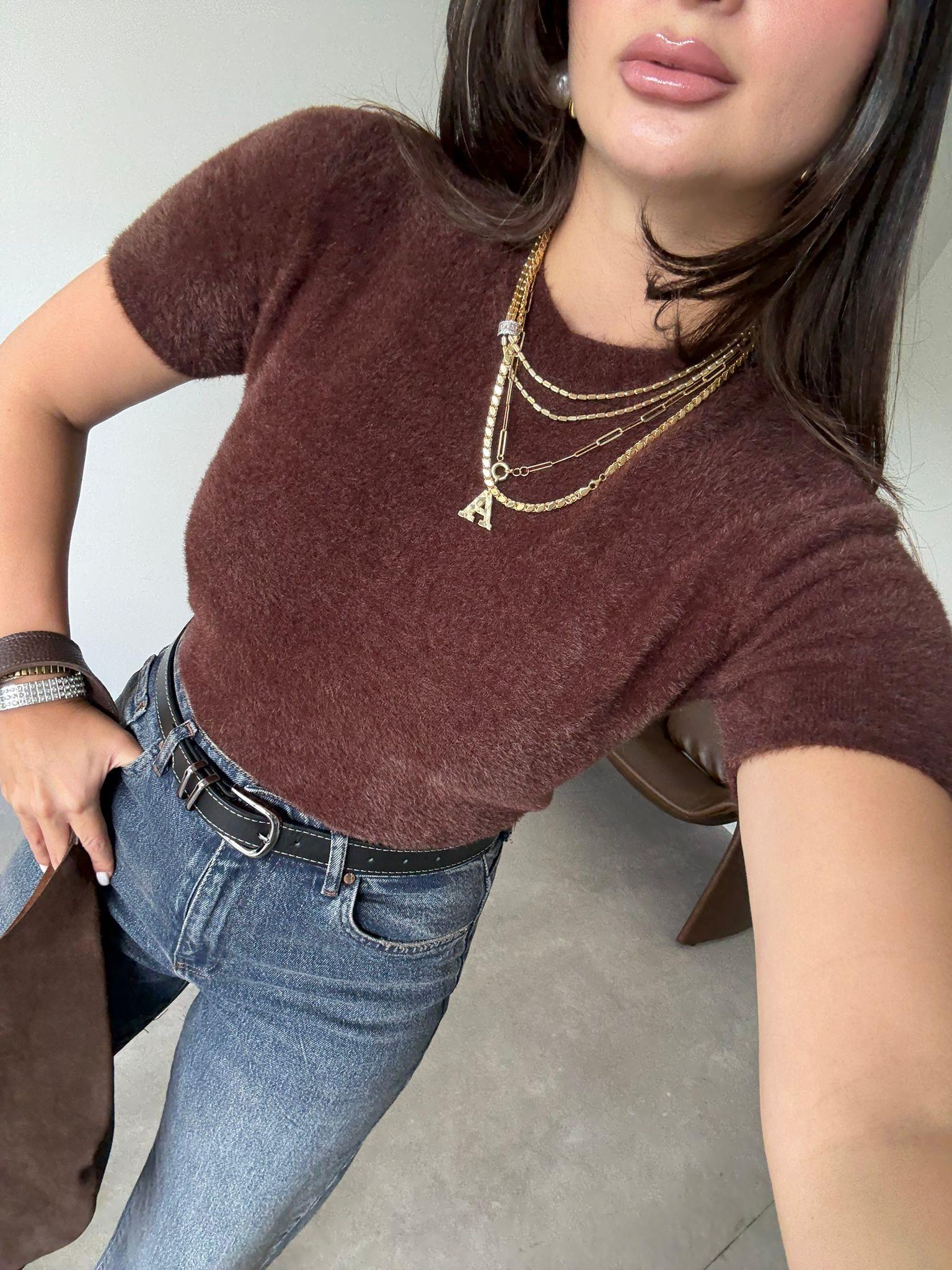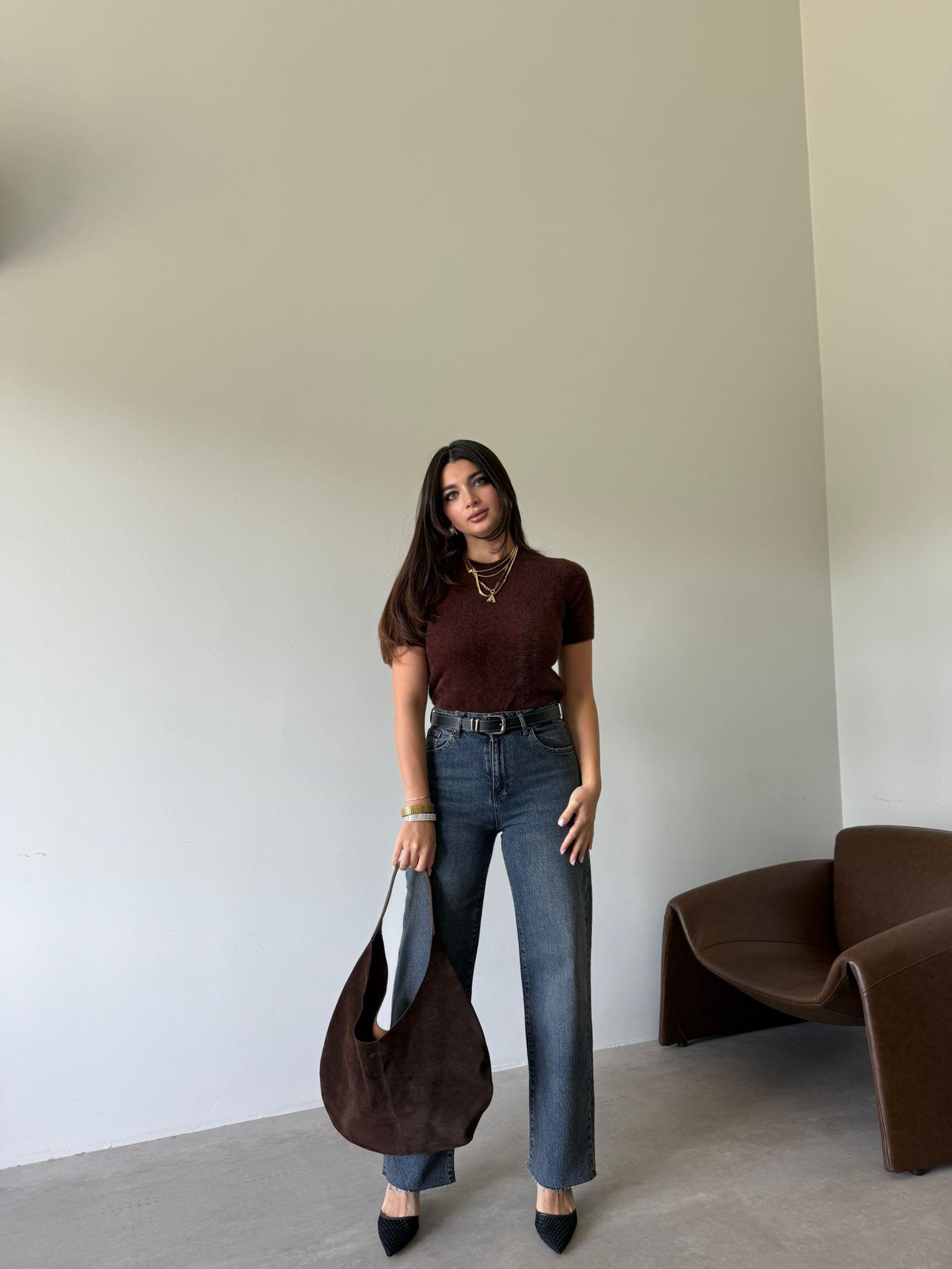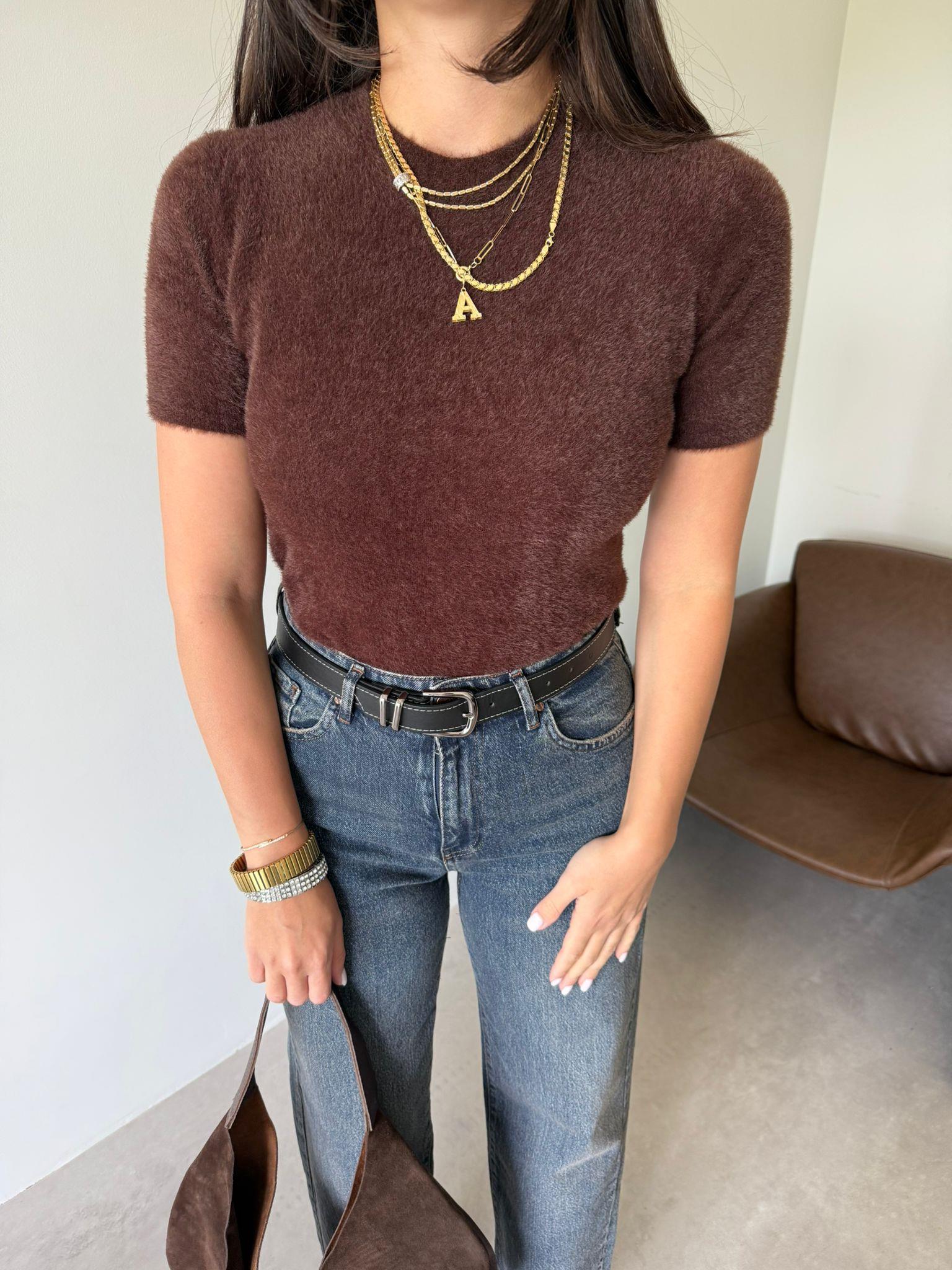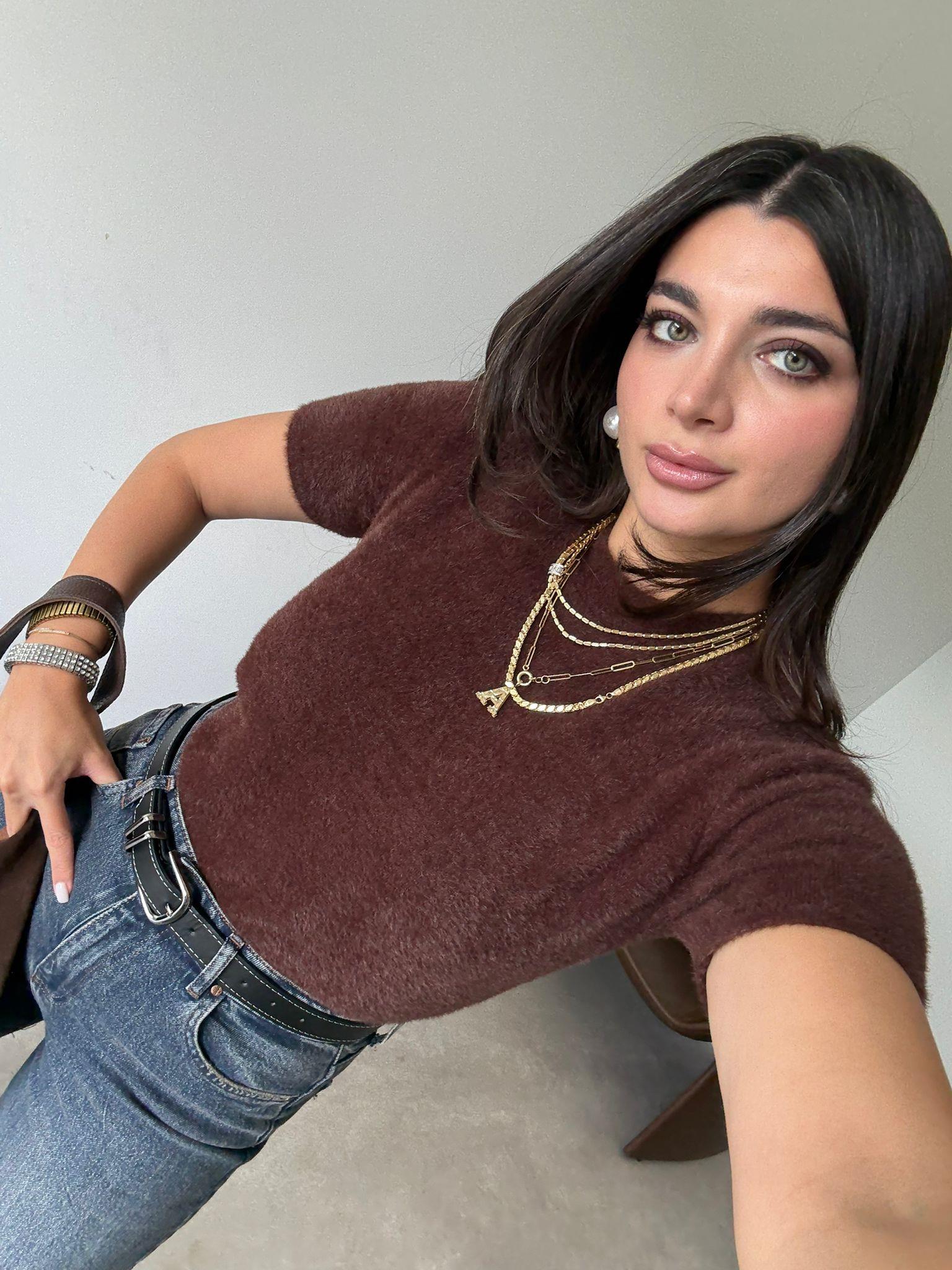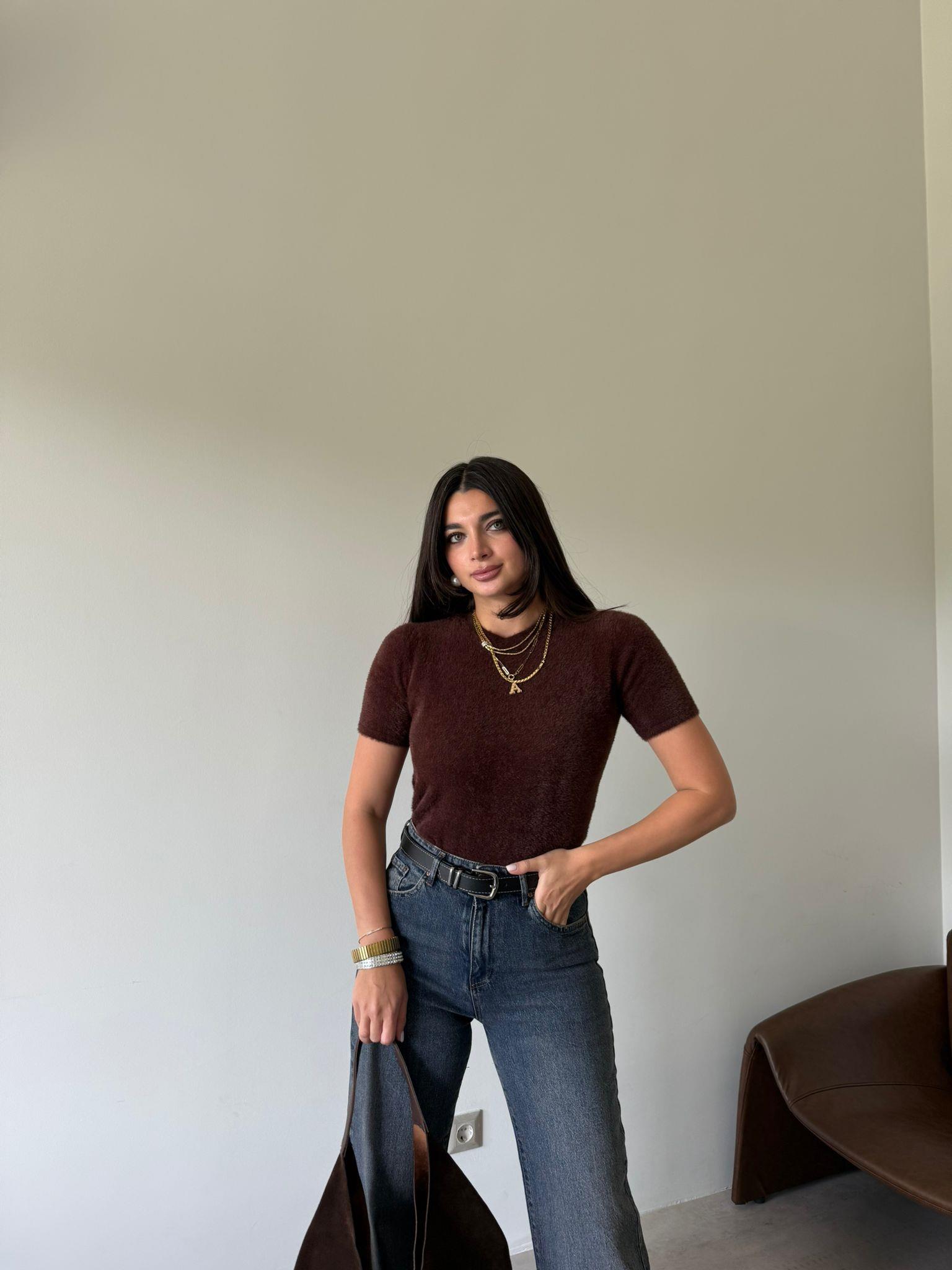 Kahve Kırçıllı Yumuşacık Kısa Kol Bluz (14188)
