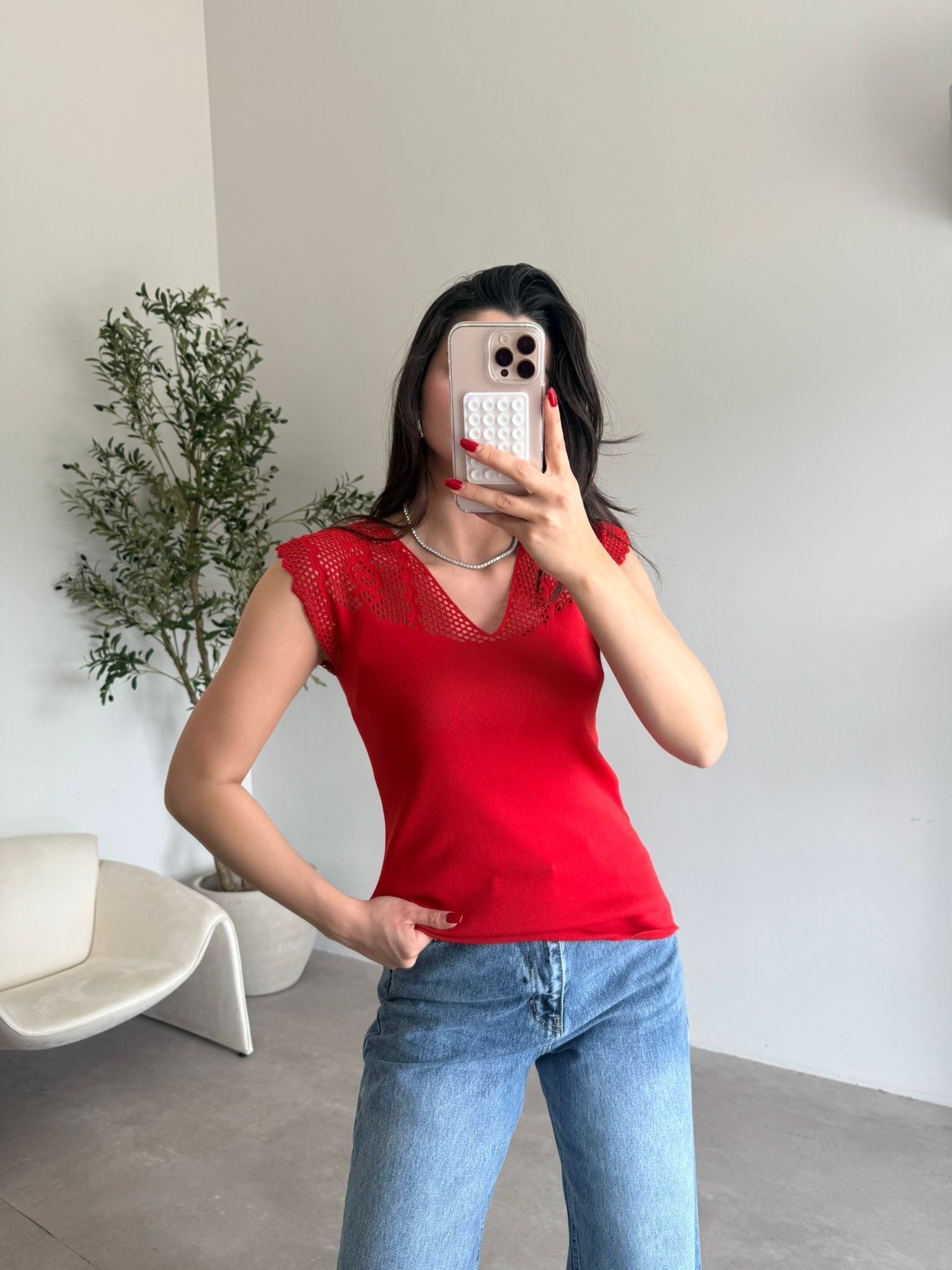 Kırmızı V Yaka Dantelli Bluz (12705)