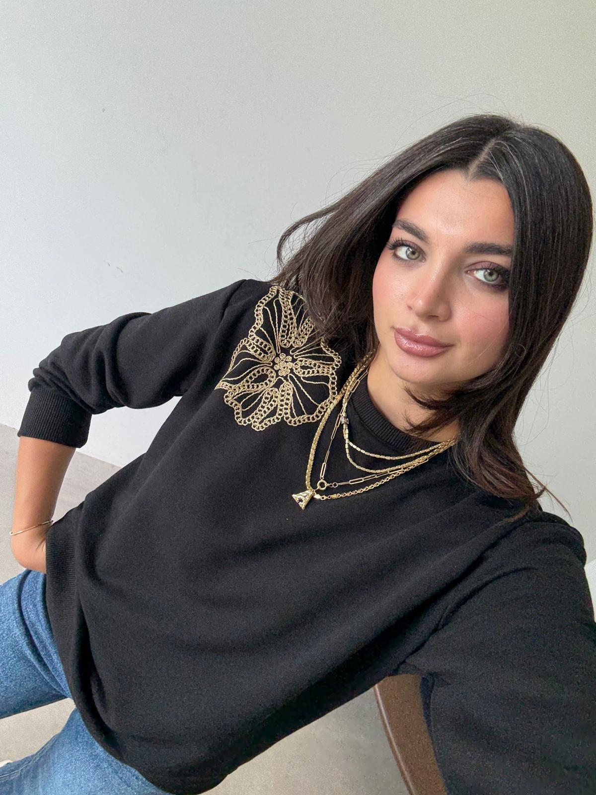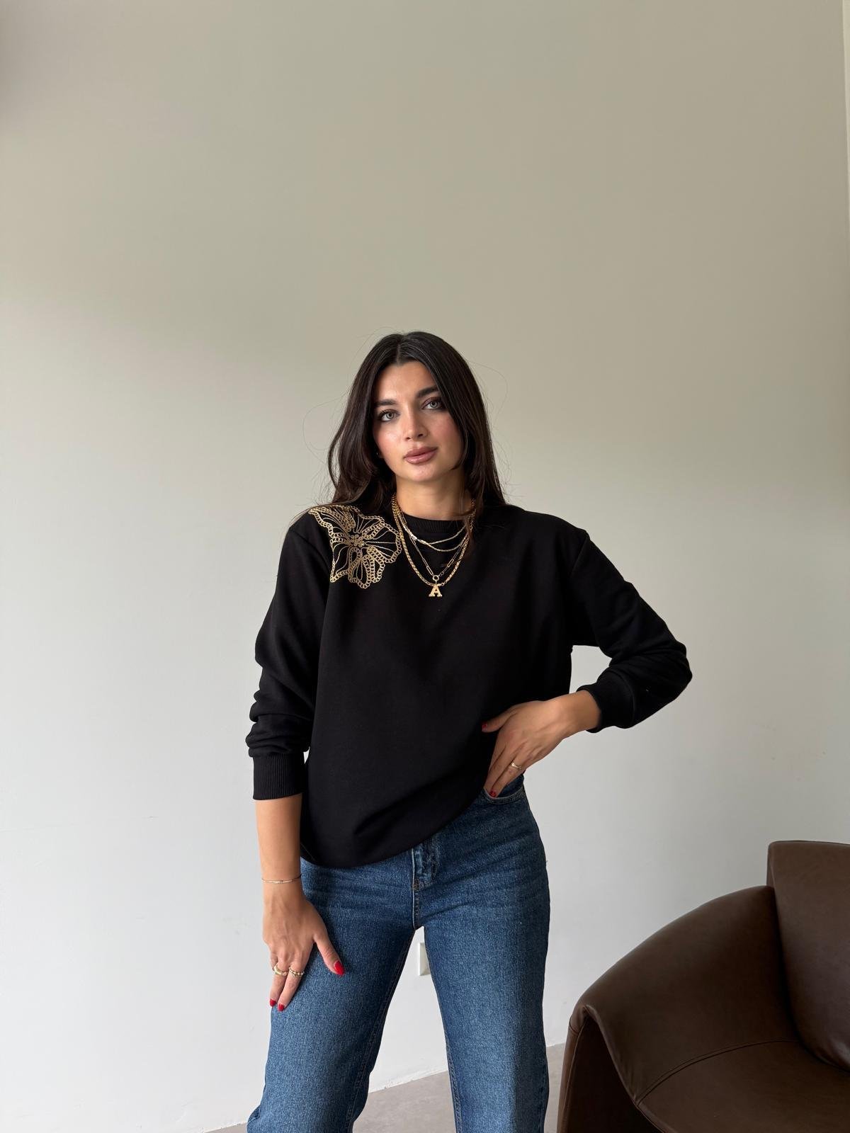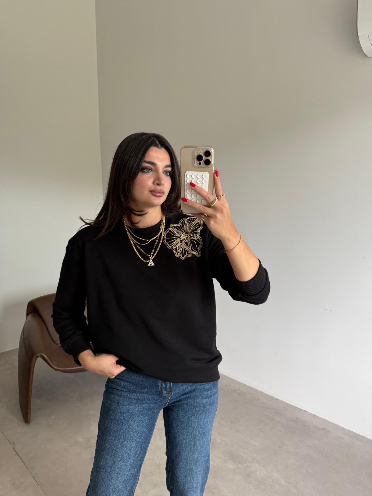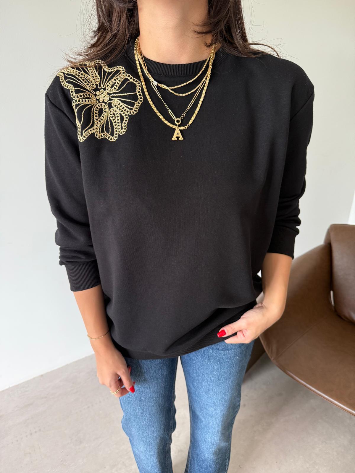 Siyah Çiçek Nakışlı Basic Sweat (14129)
