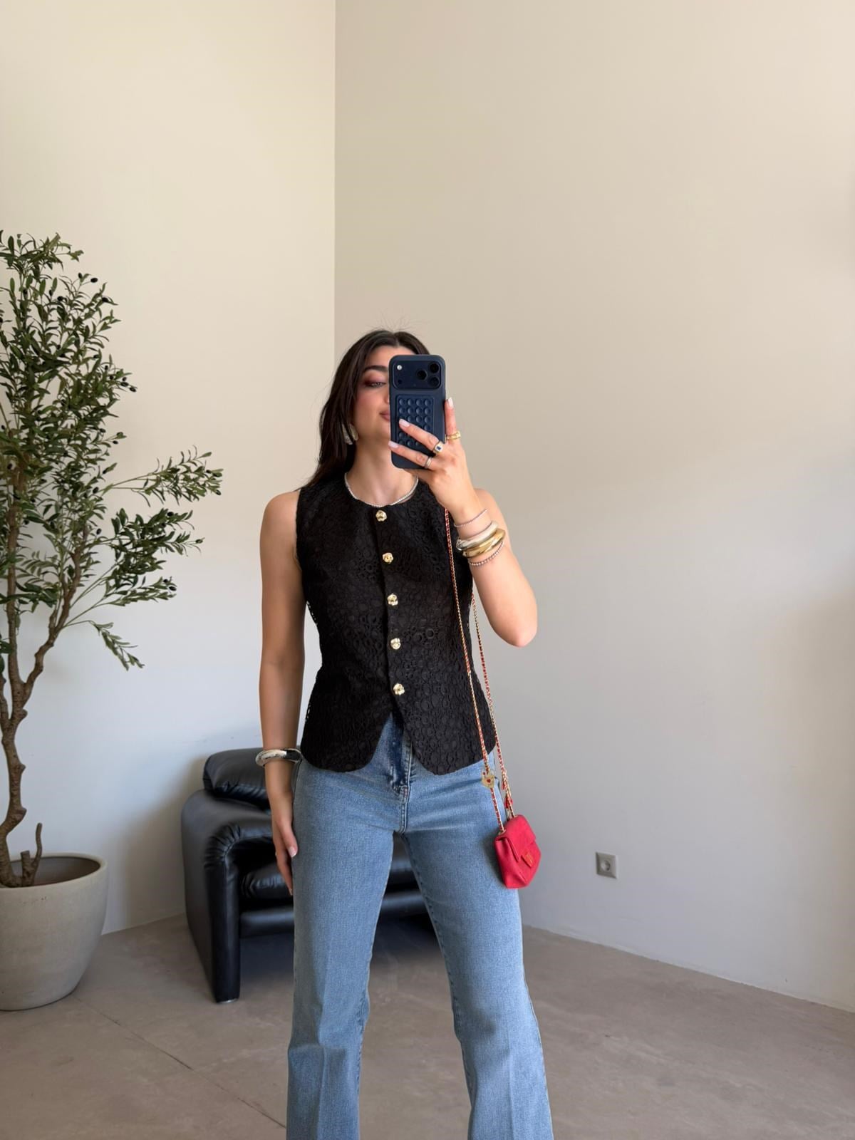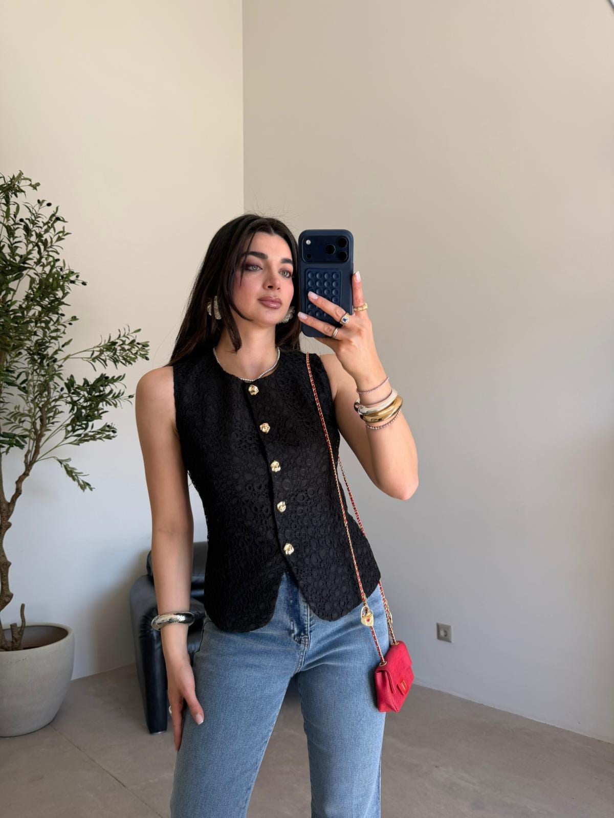 Siyah Gold Düğmeli Dantel Yelek (15561)