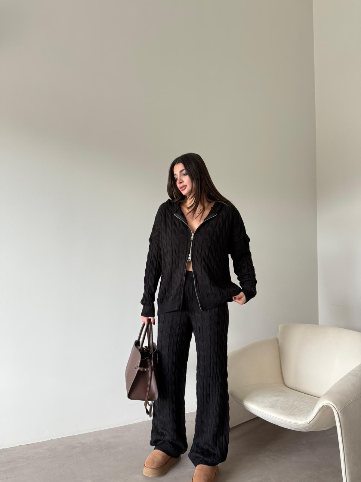 Siyah Kapüşonlu Saç Örgü Triko Takım (14427)